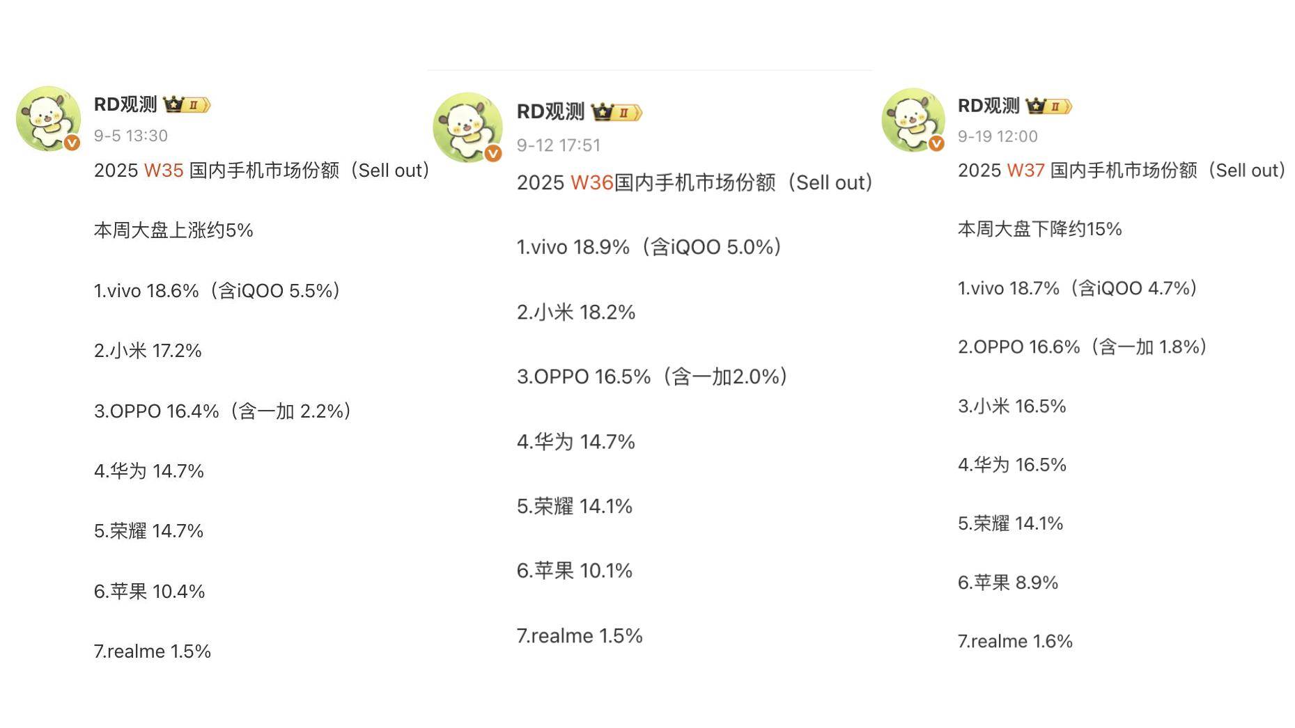 然后是荣耀手机,它的市场份额为14.8%,作为横向对比,2025年7月份市场份额为14.3%。排名第五的是华为,它的市场份额为14.4%,和7月份(13.6%)相比有明显的提升。随着降价促销和软件生态的完善,搭载原生鸿蒙系统的机型销量在回升,在最近三周(W35-W37)周榜中已经重回榜单第四名,华为原生鸿蒙系统未来可期。
