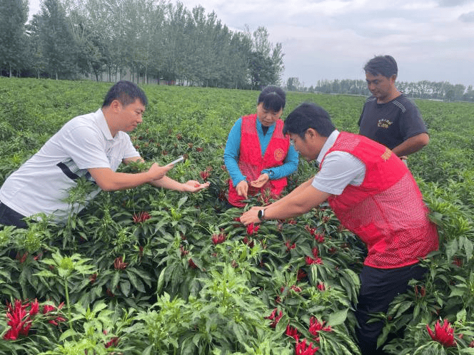 近日,河南省小麦辣椒套种产业科技特派员服务团一行在团长姚秋菊研究员带领下,深入鄢陵县马栏镇大路庄村和只乐镇寺东张村的辣椒种植基地,实地考察朝天椒后期生长情况。